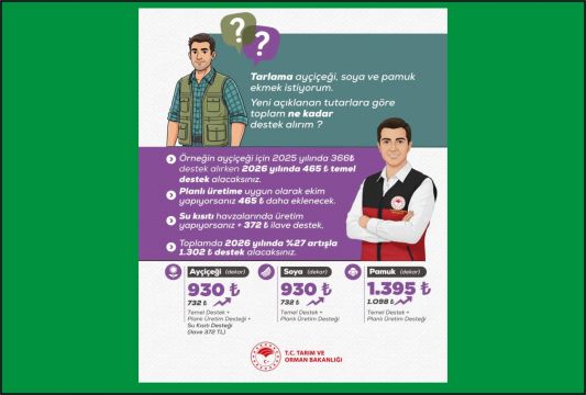 Açıklanan verilere göre, 2026 yılında dekara verilen temel destek katsayısı bir önceki yıla göre %27 artırılarak 310 TL olarak belirlendi. Hububat, bakliyat, yağlı tohumlar ve yem bitkilerinin tamamında destek miktarları yükseltildi.