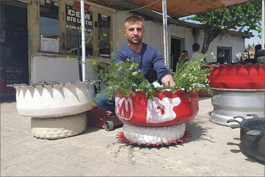 Çivril’de lastik tamir işi yapan Cem Güllübaş eski lastikleri saksıya dönüştürdü.