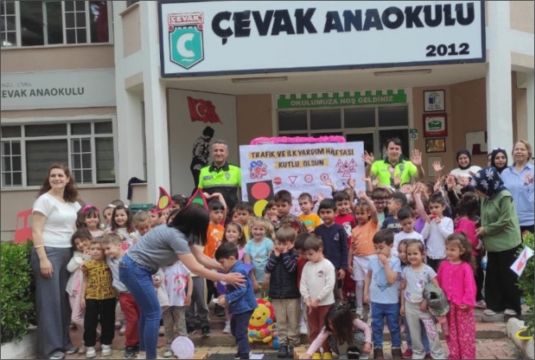 Trafik Haftası etkinliklerinde Çivril İlçe Emniyet Müdürlüğü Trafik Şube Büro Amirliği ekipleri anlamlı bir etkinliğe imza attı. Hafta kapsamında ilçede eğitim veren ÇEVAK Anaokulunu ziyarete den ekip, öğrencilere trafik kural ve işaretlerini anlattı. Anasınıfı öğrencileri trafik kural ve işaretlerini öğrenirken eğlendi.
