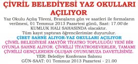 ÇİVRİL BELEDİYESİ YAZ OKULLARI AÇILIYOR ÇİVRİL BELEDİYESİ YAZ OKULLARI AÇILIYOR Yaz Okulu Açılış Töreni, Branşların gün ve saatleri ile formaların verilmesi, 01 Temmuz 2013 Pazartesi günü, Saat: 17.00'de KUMLUK HALI SAHASINDA olacaktır. Tüm kayıt yaptıran öğrencilerimize duyurulur. ÇİBET SAHNE ALIYOR-YAZ OKULLARI AÇILIYOR ÇİVRİL BELEDİYESİ AMATÖR TİYATRO TOPLULUĞU YENİ BİR OYUNLA SAHNE ALIYOR. ÇİVRİLLİ TİYATROSEVERLER, TAMAMI ÇİVRİLLİ GENÇLERDEN OLUŞAN OYUNUMUZA DAVETLİSİNİZ. YER: Belediye Konferans Salonu GÜN-SAAT: 01 Temmuz 2013 Pazartesi - 21.00